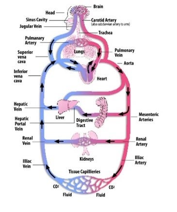 The cells don’t absorb all the oxygen the arteries transport to the body tissues. Besides containing some residual oxygen, the blood which returns via the right heart to the lungs, transports by-products (CO2, H2O, lactate and protons) from the metabolic process. In the lungs, CO2 is exchanged for oxygen. The liver and other body organs recycle or deactivate the other by-products. Of these, lactate is recycled as a (very efficient) fuel. All parts of the oxygen pathway are essential and contribute to the one integrated oxygen uptake, transport and utilisation system.
