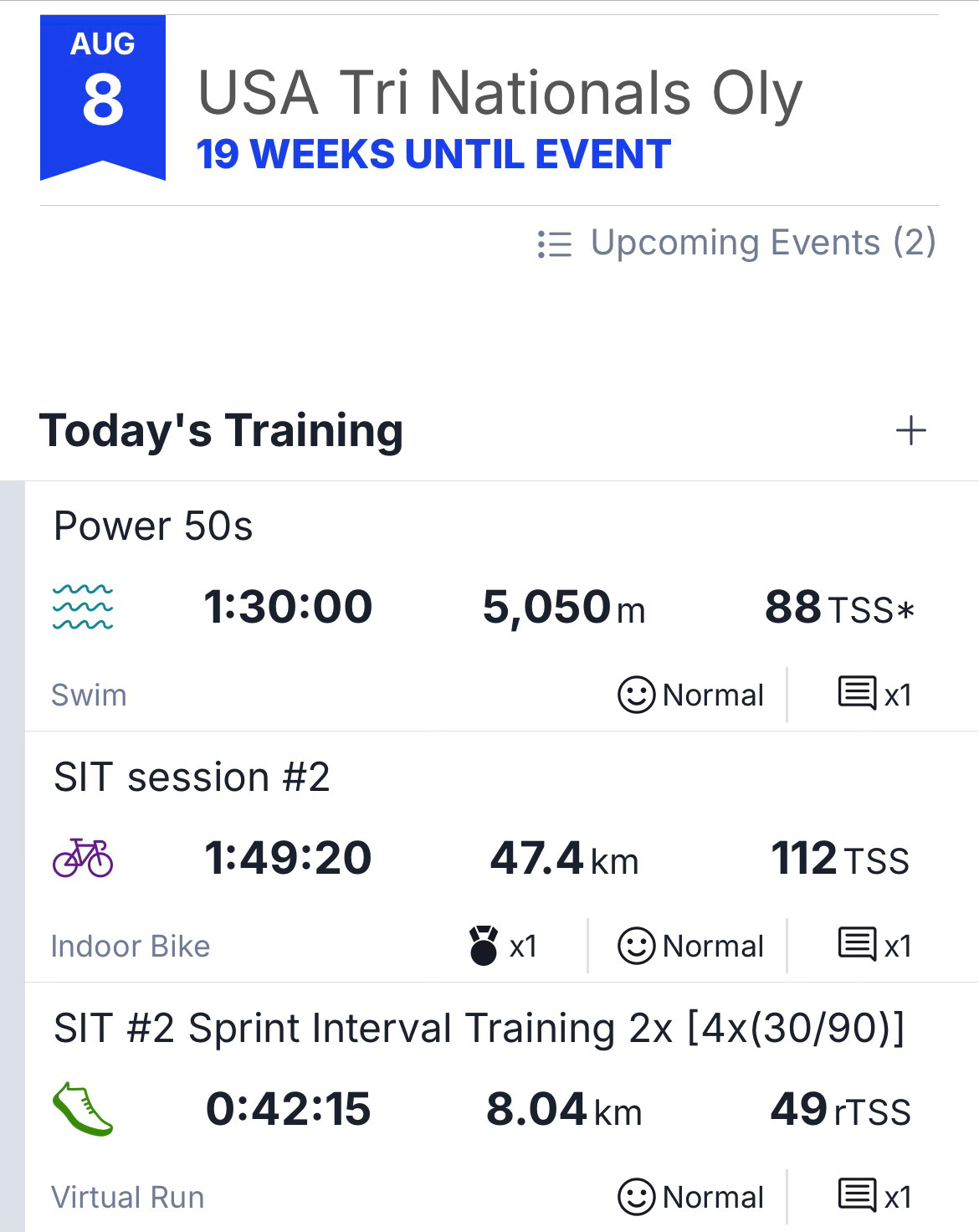 This session is either a race-simulation session or Zone 6 intervals. Last week was Zone 6 intervals and shared below.