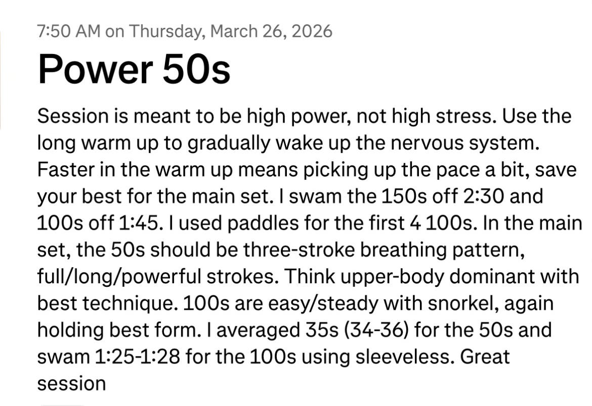 My notes following the swim. I used a sleeveless wetsuit until the end of the main set.