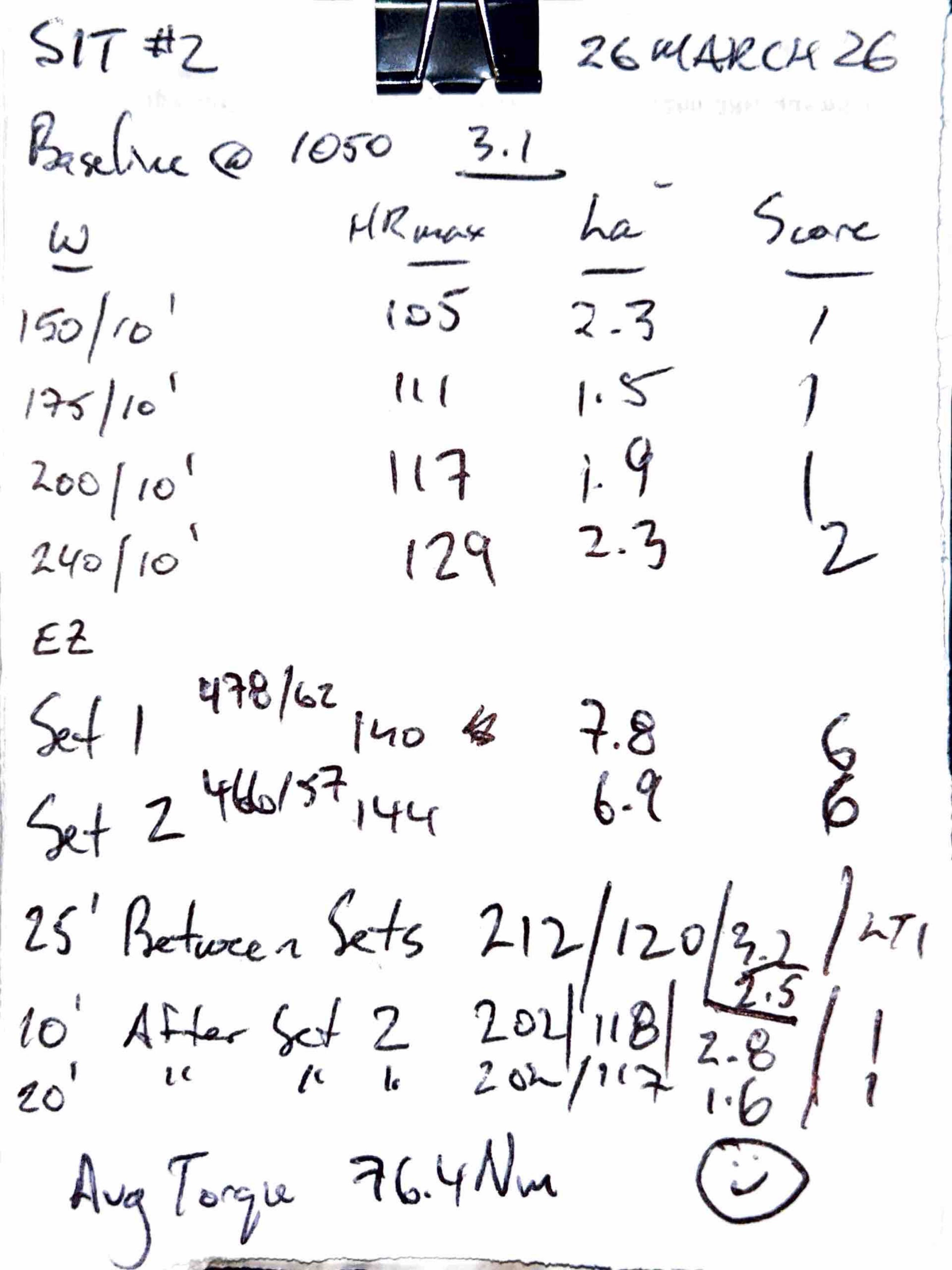 Once again, I like a long warm-up. I do a submax test with ten minutes steps that takes me to LT1 power. Then I do ten minutes of Tempo / Zone 3. Last week’s notes are below.